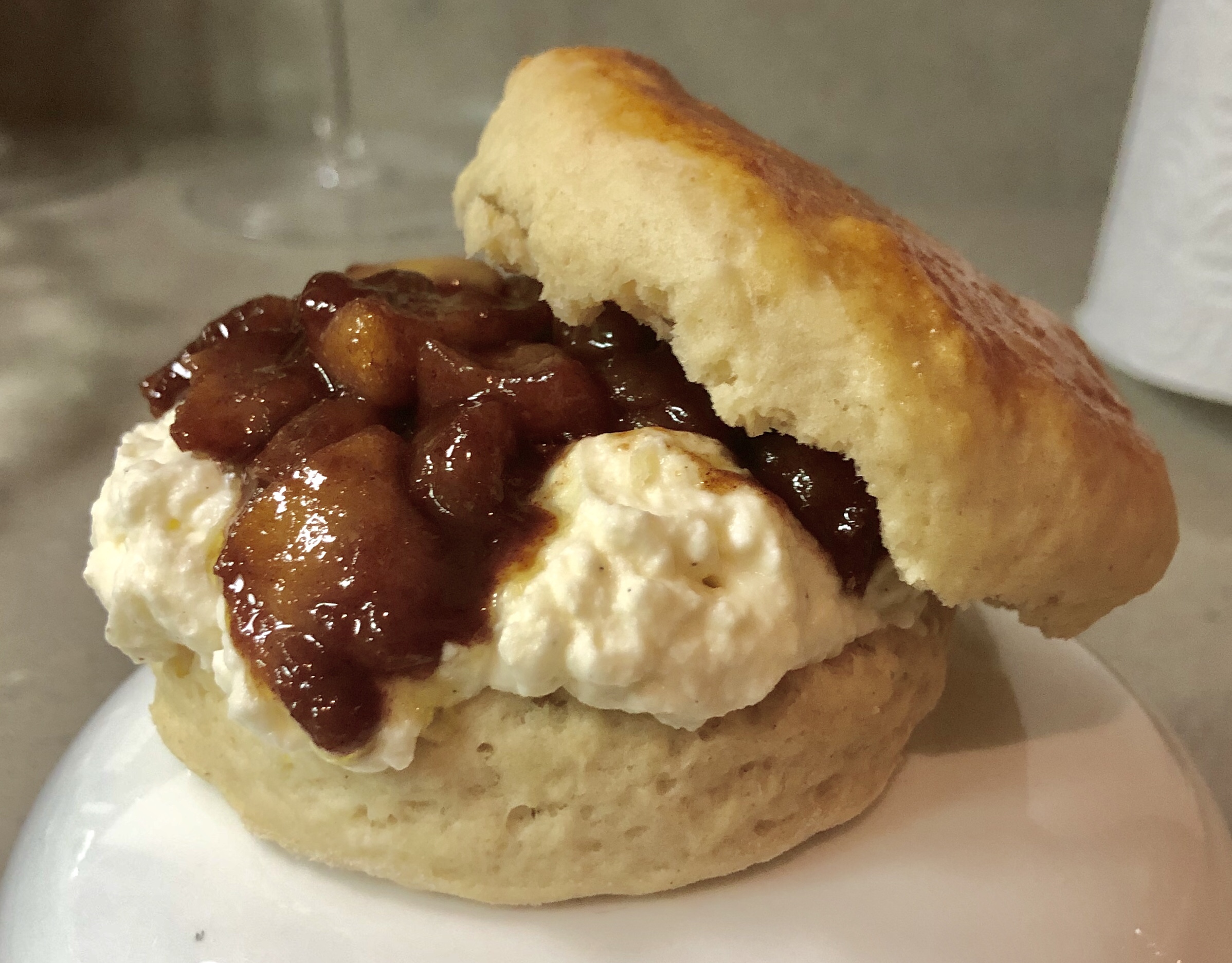 To serve the scones, just break in half and spoon on as much or as little of the cream and apples as you like.